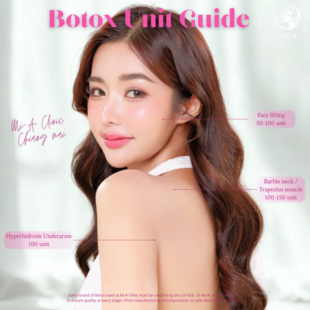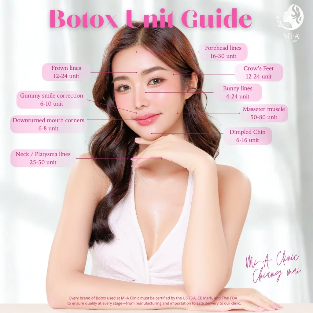 การฉีดโบท็อกซ์แต่ละตำแหน่งจำเป็นต้องใช้ปริมาณยูนิตที่แตกต่างกัน จึงต้องอาศัยการประเมินที่แม่นยำโดยแพทย์ผู้เชี่ยวชาญ เนื่องจากกล้ามเนื้อในแต่ละบริเวณมีขนาด ความลึก และทิศทางการทำงานที่ไม่เหมือนกัน เพื่อให้ผลลัพธ์ที่ได้ดูเป็นธรรมชาติ ปลอดภัย และตรงจุดอย่างแท้จริง แพทย์จะต้องออกแบบแผนการรักษาเฉพาะบุคคลอย่างเหมาะสมที่สุด